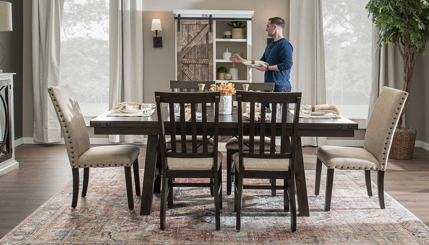 Old world beauty meets new world charm in my timeless Iris collection. Made from 6mm solid Acacia laid over a substructure with Rubberwood accents and other Acacia solids. Repurposed into beautiful furniture, each piece is unique to itself. Built for the most discerning consumer this table features a built-in leaf. The length can be adjusted from 60″ to 78". The table is also double gear driven for ease of operation. The chairs are solid Rubberwood, and underneath the table, the look is completed with Iron a stretcher. The Parsons chairs are upholstered in a beautiful chenille fabric but don't worry, it is 100% polyester so they are very family-friendly.