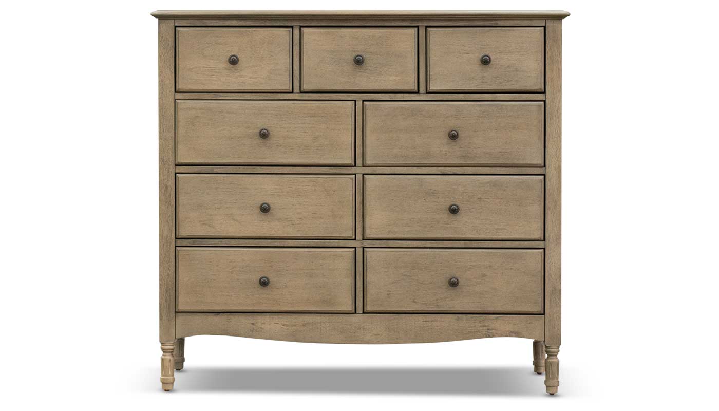 Our Amelia bedroom collection blends rustic elegance with modern functionality. Crafted from Pine solids and Acacia veneers, this collection showcases a beautiful brushed Oak finish that enhances its natural wood grain. The bed features a luxurious upholstered and tufted headboard, paired with an upholstered footboard for added comfort and style. Our Amelia case goods are designed for durability with French and English dovetail joints, while the ball-bearing glide system ensures smooth drawer operation. Painted interior drawers add a touch of sophistication, and the nightstand includes a convenient power pack with USB connections, making it perfect for modern living. Sink into a dreamy sleep with our Amelia bedroom collection.