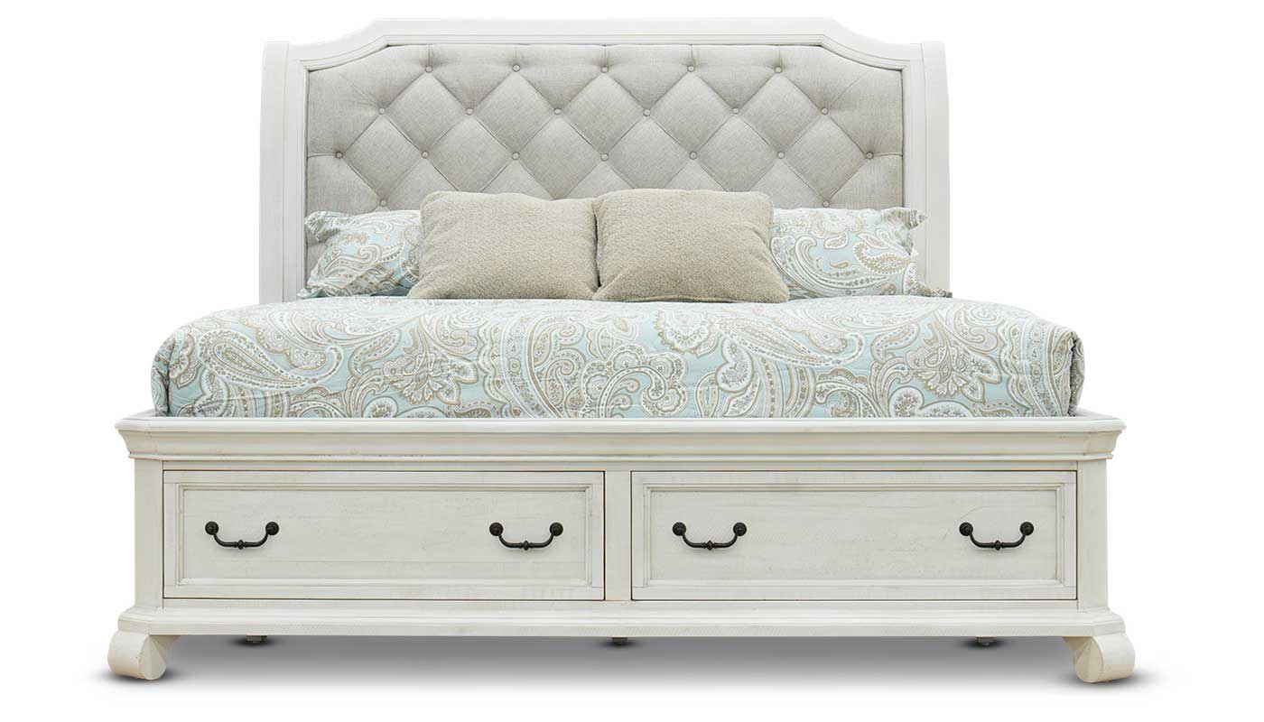 Welcome elegant European-inspired styling to your home with our Bocelli collection. The brilliant crafting on this set wows with every detail! The Bocelli collection is constructed using Pine solids and veneers. Drawers are assembled using English and French dovetail construction with a ball-bearing glide system that makes each movement smooth. The antique white finish and weathered bronze hardware complement both the tufted upholstery on the headboard and the elegant scrollwork on select pieces. The bed also features deep drawers providing you with additional storage and the perfect space to store clothes or other bulky items. Let our Bocelli collection create a warm and inviting chateau feel within your home.