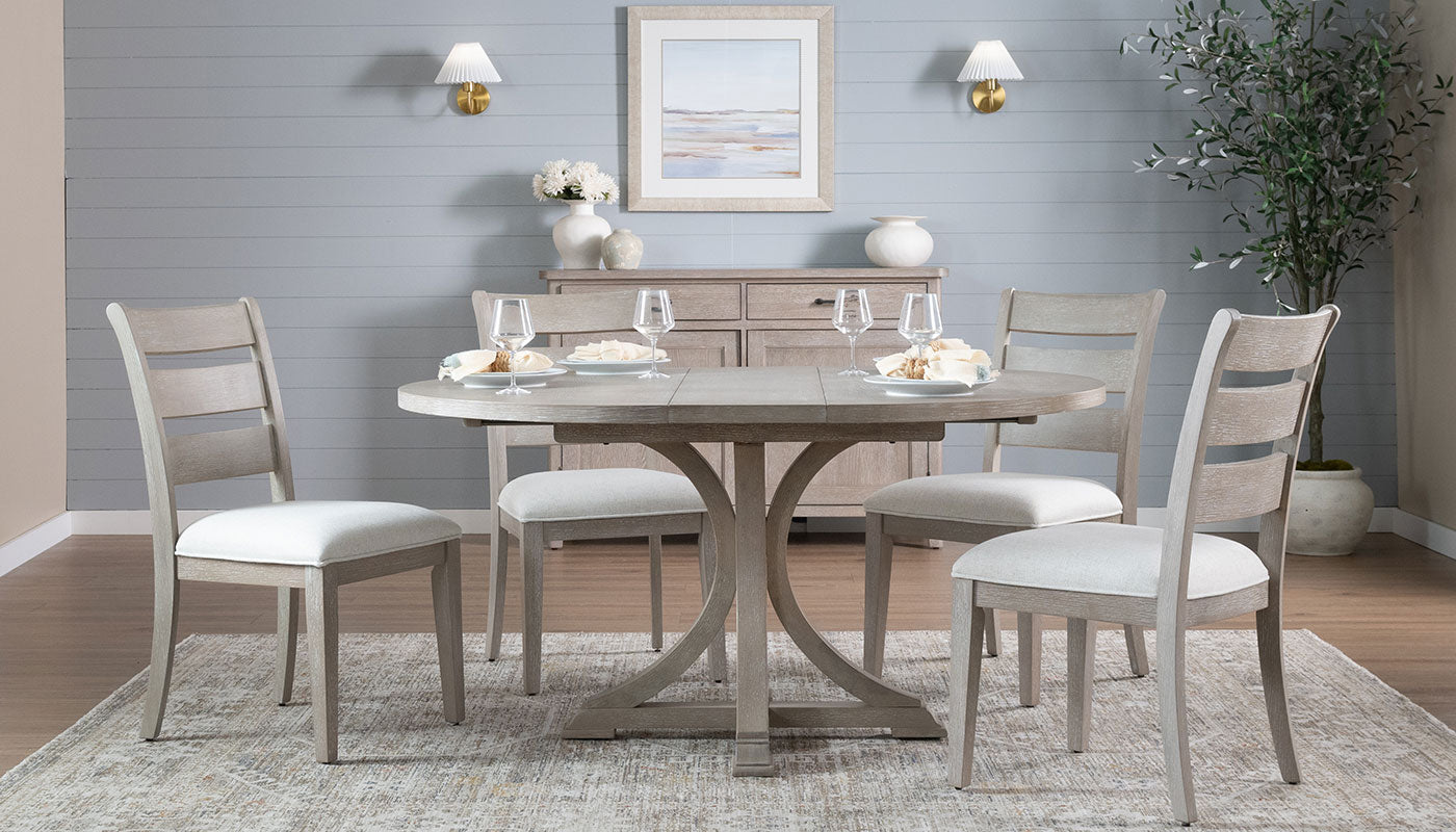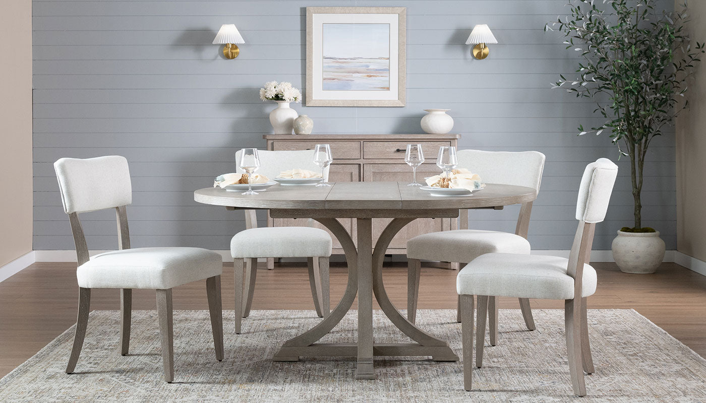 Our Candice dining collection brings timeless style and everyday functionality to your home. Crafted from Rubberwood solids with an Oak veneer in a brushed grey finish, this collection is built for both beauty and durability. This collection features a 48” round dining table, wooden side chairs, or upholstered side chairs—comfortably seating up to 4. Complete the look with the matching buffet for added storage and style. Our Candice collection blends casual elegance with everyday practicality.