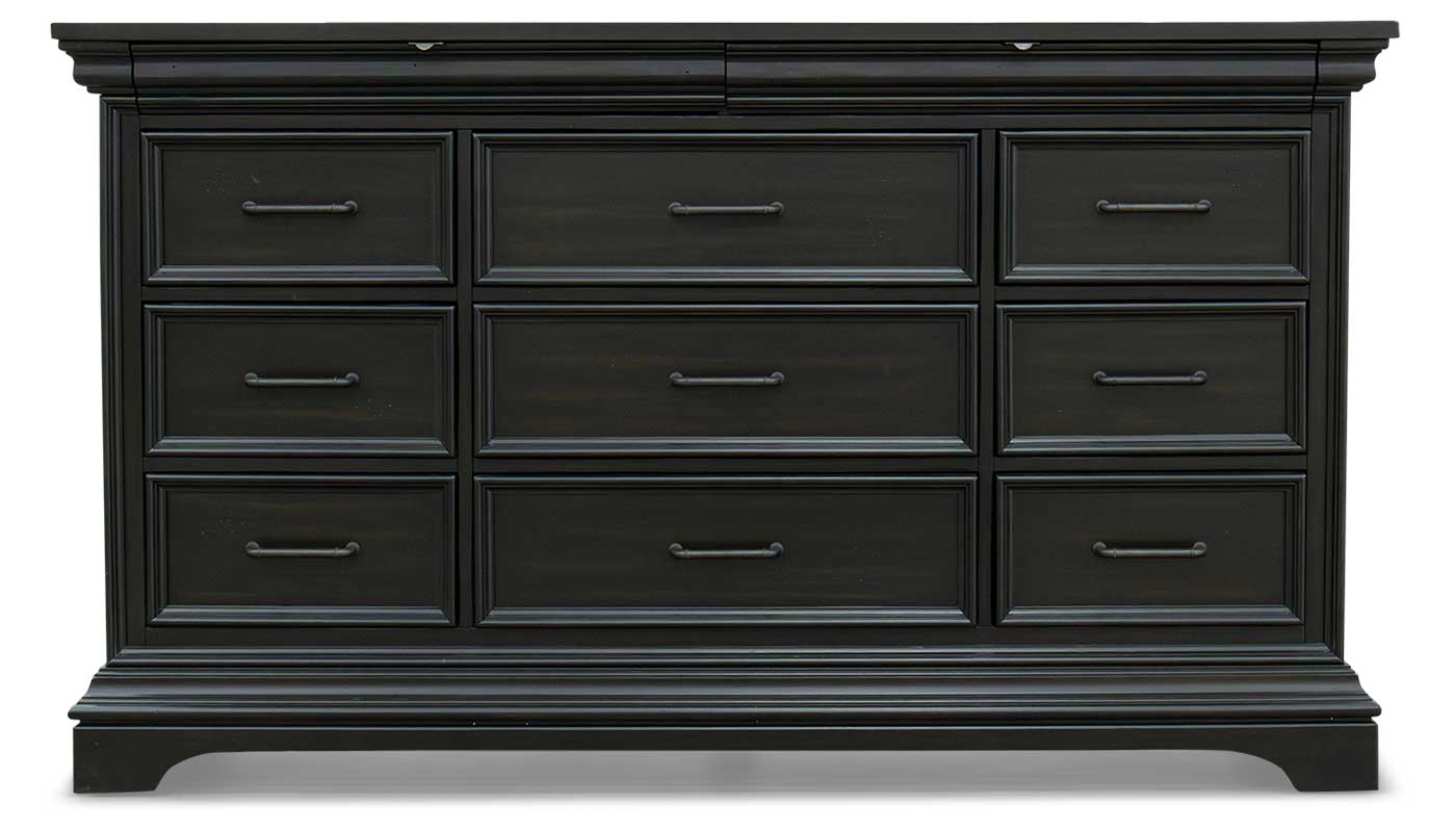 Experience luxury and refinement with the Clinton bedroom collection, where every detail exudes opulence and timeless appeal, transforming your bedroom into a sanctuary fit for royalty. Crafted with the finest pine solids adorned with an opulent Acacia veneer, each piece radiates grandeur and enduring charm. The centerpiece of this collection is the bed, featuring a strikingly tall headboard and majestic footboard with discreet storage, offering both style and functionality. Meticulously crafted drawers showcase French and English dovetail construction, ensuring durability and refinement, while the ball-bearing glide systems provide smooth and effortless operation. Embrace the regal ambiance with the addition of nightstands boasting a power pack and LED nightlight, seamlessly blending modern convenience with traditional allure. Our Clinton bedroom collection is a regal testament to timeless elegance and classic sophistication.
