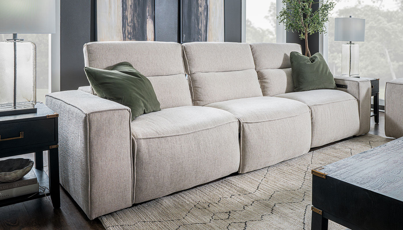 Discover the perfect blend of luxury and functionality with our contemporary Colter II power reclining sectional. Upholstered in a soft dove-colored 100% polyester fabric, this sectional exudes modern elegance while being durable and easy to maintain. Our Colter sectional is engineered with premium mechanisms, offering smooth and effortless power reclining at the touch of a button. The added feature of a power headrest ensures personalized comfort, making every seating experience a relaxing retreat. Sink into the plush cushions, crafted with sinuous coils and down and feather seating, providing unmatched support and coziness. The modular design allows for versatile configurations, making it a seamless fit for any living space. Our Colter II power reclining sectional is designed to elevate your living room, combining contemporary style with superior comfort.