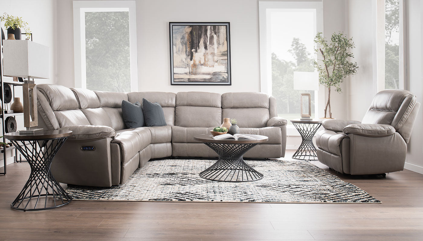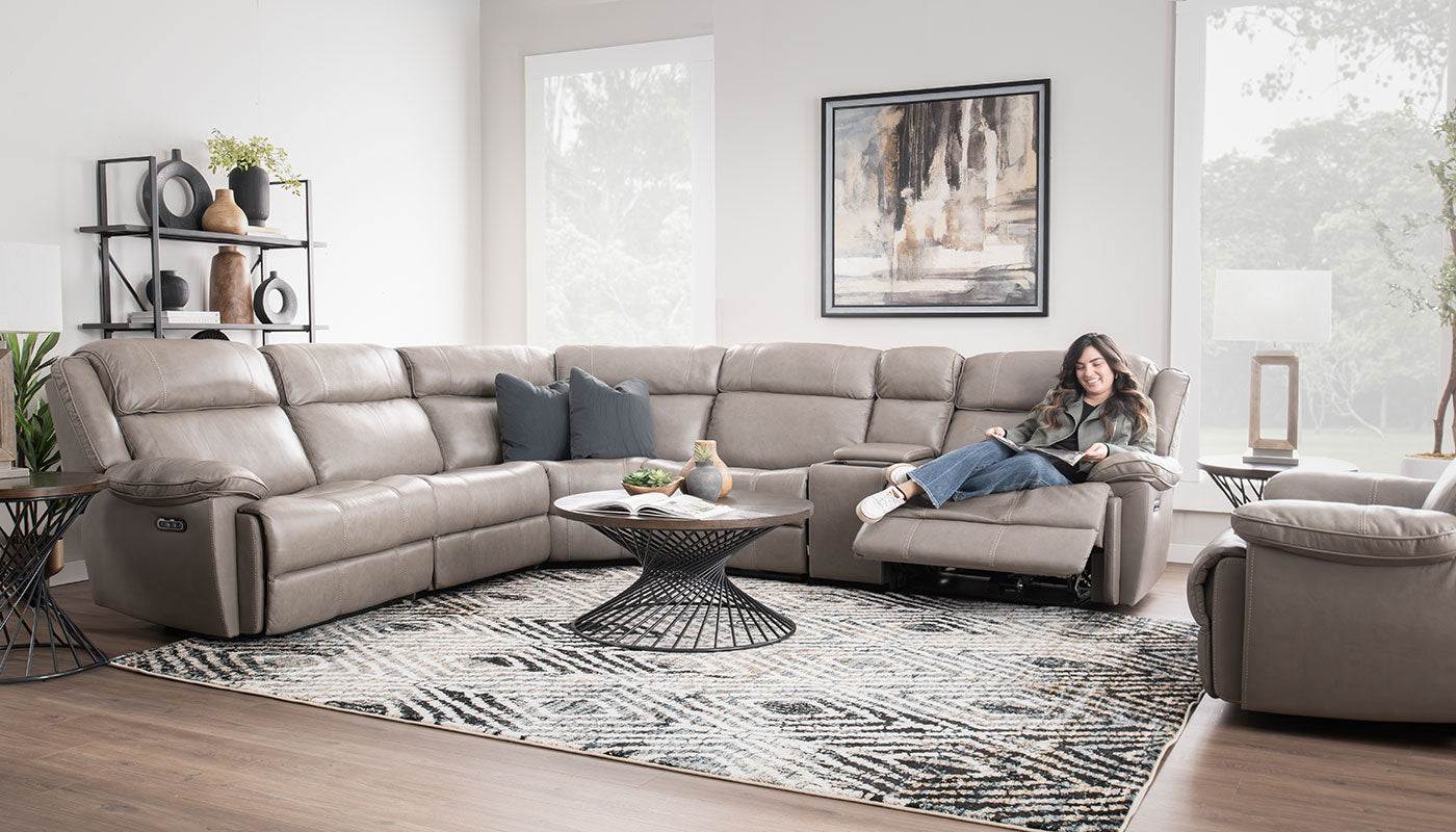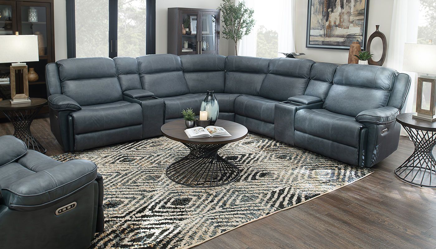 Discover the epitome of luxury and innovation with our Easthill II leather power reclining sectional, a testament to the perfect blend of sophistication, comfort, and cutting-edge technology. Crafted with meticulous attention to detail, this sectional is constructed using high-quality materials with a sturdy frame to ensure durability and longevity. It is upholstered in a soft top-grain leather, making it easy to maintain and clean. The power reclining mechanism allows you to easily adjust the position of the seat to your desired level of comfort. The power headrest further enhances your relaxation experience by providing adjustable head and neck support, ensuring optimal comfort while watching TV, reading, or simply unwinding. Our Easthill II collection takes functionality to a new level with a console that features a wireless charging station, hidden cup holders, and a storage compartment. These features allow you to comfortably work or enjoy entertainment while keeping your devices powered and your living room tidy. The modular design of the leather sectional allows you to build it to any size or shape you want to ensure it fits your space. With its modular design, convenient console with storage, and adjustable reclining positions, our Easthill II leather power reclining modular sectional is designed to provide you and your family with the ultimate lounging experience! Available in navy and stone.