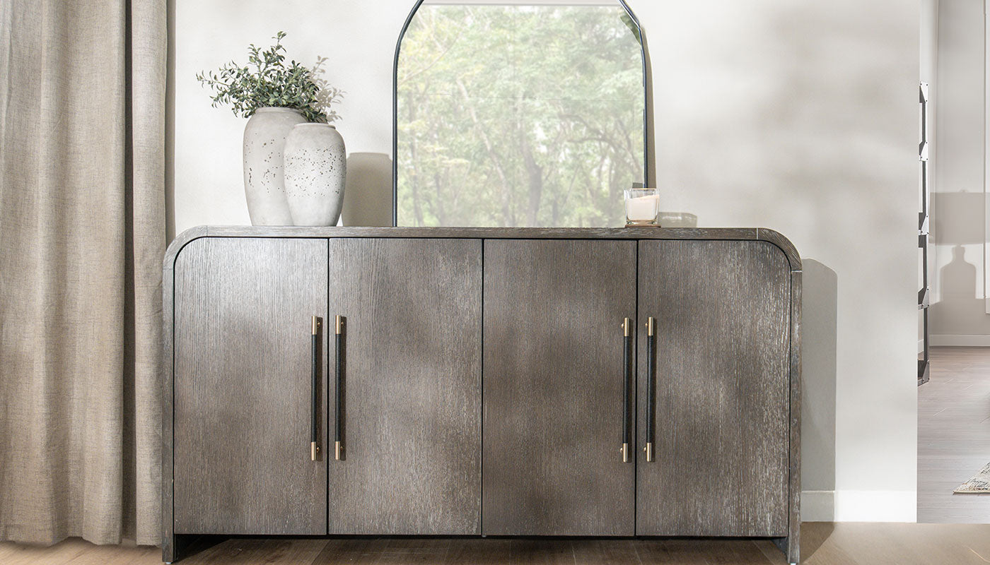 Our Mena dining room collection blends understated elegance with timeless craftsmanship. Made from Acacia solids with a warm Oak veneer finish, this collection offers versatility with your choice of a round or rectangular dining table. The round table includes an 18" leaf and features a smooth cable glide system for effortless expansion. Choose from two upholstered chair options, both upholstered in a family-friendly fabric that is perfect for busy households. Complete the look with the matching buffet, featuring two drawers with enclosed shelves providing ample storage space for your dining essentials. With its refined details and sophisticated charm, our Mena collection is perfect for both everyday dining and special gatherings.