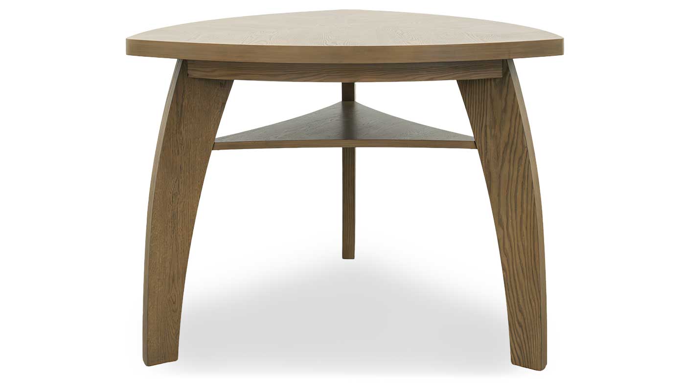 Bring a touch of modern fun to your dining space with our Triangle dining room collection. Designed to seat up to five comfortably, this bar-height table stands out with its unique triangular shape and gracefully arched legs, crafted from Rubberwood solids and finished in a warm Oak veneer. The seating is both stylish and practical, featuring barstools with a smooth 180-degree swivel and a curved bench, all upholstered in a black or saddle brown, leather-like material that is family-friendly and easy to maintain. Perfect for casual gatherings or lively game nights, our Triangle collection is a bold statement in any dining space.